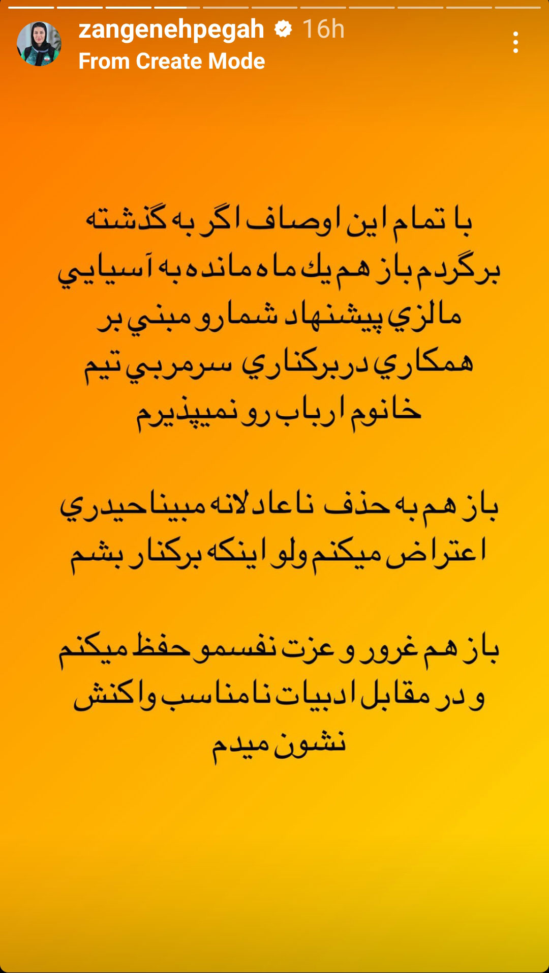 باز هم به حذف ناعادلانه مبینا حیدری اعتراض میکنم حتی اگر به قیمت حذف من تمام بشود. باز هم غرور و عزتنفسم را حفظ میکنم و در مقابل ادبیات نامناسب واکنش نشان میدهم.