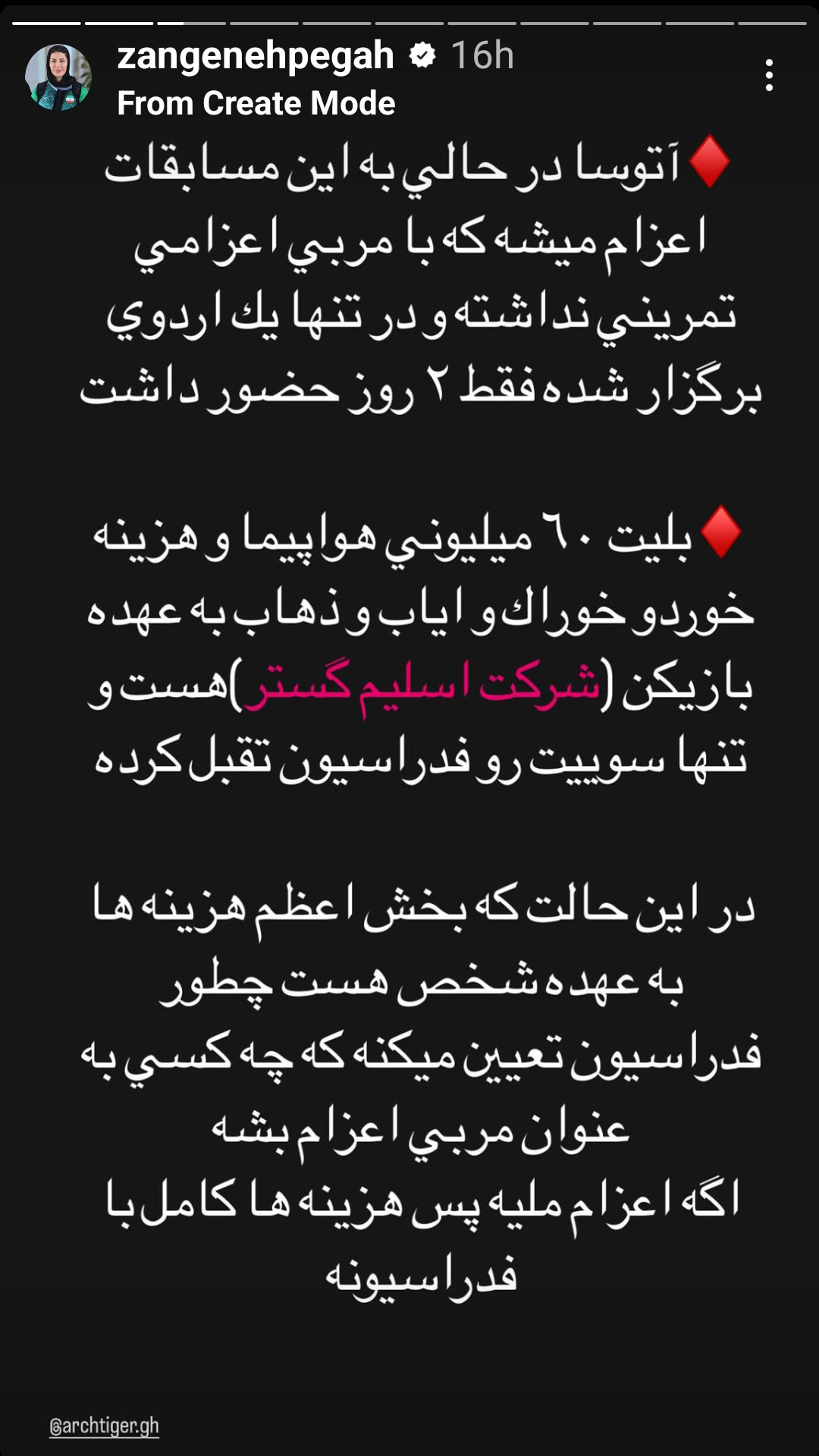 به گزارش افرا ورزش، پگاه زنگنه قهرمان و مربی سابق تیم ملی کاراته در صفحه شخصی خود به انتقاد از سیاستهای دوگانه فدراسیون کاراته پرداخته و آن را نوعی تلافیجویی قلمداد کرده است.